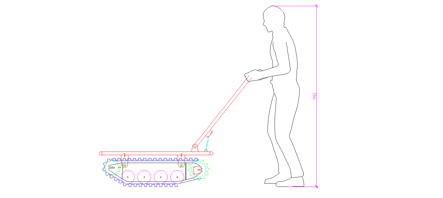 В первом приближении было решено использовать наиболее короткую (периметр 2,1 м) композитную гусеницу шириной 38 см. Гусеничный модуль при этом получается около 1 метра в длину. На схеме изображен человек ростом 176 см (чуть выше среднего по РФ) для визуальной пропорции. В следующих вариантах устройства будем использовать более длинную гусеницу, соответственно и длина модуля увеличится.