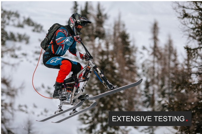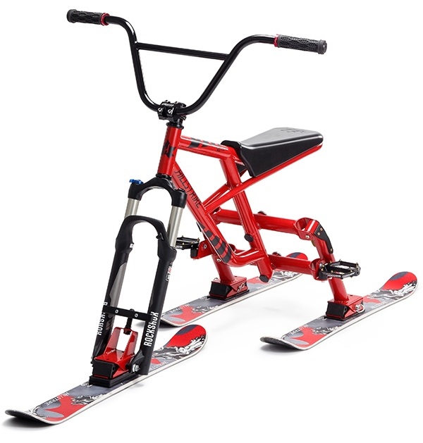 Собственно их сноубайк имеет специфичное строение а именно три лыжи. Это позволяет лучше контролировать скольжение и торможение. Т.е. этот снаряд максимально приближен по ощущениям к классической горнолыжной технике катания. Оно и понятно, пользователи ресурса Kickstarter избалованы качеством и хорошим видео, поэтому сюда с полуфабрикатами и не стоит лезть. Фирменный стиль компании как вы уже поняли красно-черный, как бы анархия на горнолыжке ))