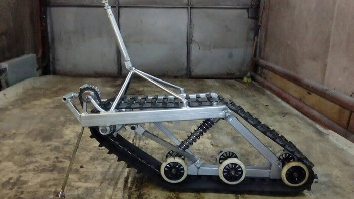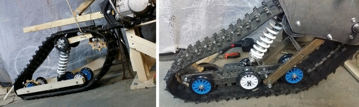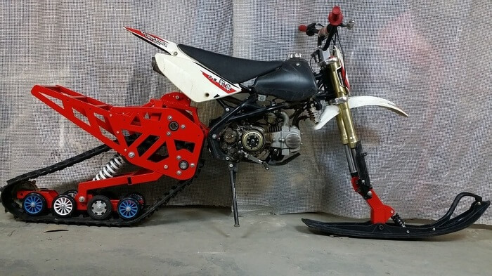 Появились и производители гусеничных комплектов для мощных мотоциклов 450 куб.см. Наиболее известный пример это TimberSled. По большому счету они одни из первых вышли на рынок как стартап, и предположили что пришло время старую технологию обернуть в новую упаковку. Стоимость комплекта зашкаливает за 300 российских рублей.