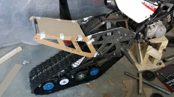 Следующая версия собиралась уже под конкретного клиента. По сути весь комплект разрабатывался с нуля с учетом ошибок и наших пожеланий упростить процесс производства. По большому счету мы пытались скопировать геометрию мировых производителей, но адаптировать под малый мотоцикл с учетом размеров гусеницы.
