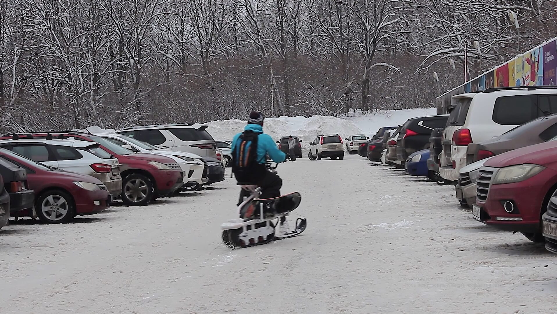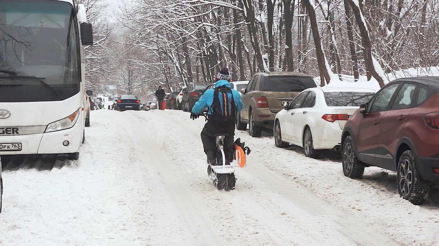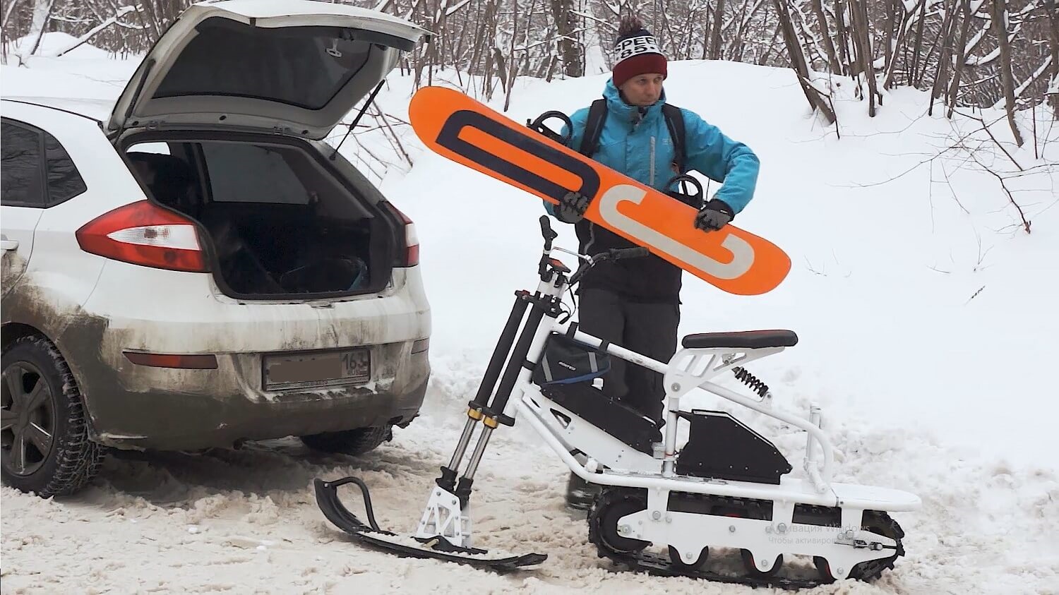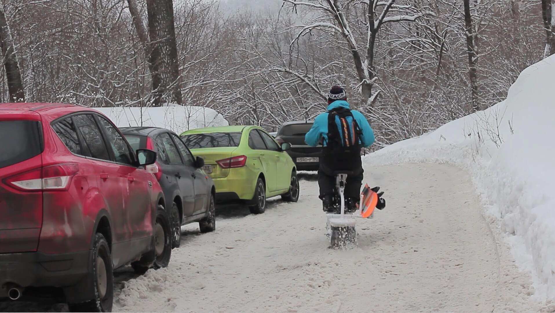 2. Достаем скутер из багажника, ставим сноуборд и спокойно едем в сторону катания, объезжая все пробки и собирая внимание всех окружающих к вашему способу передвижения.