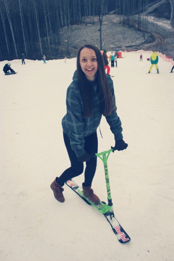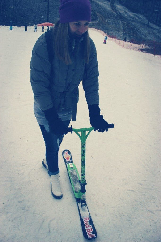 После изучения китайских представителей зимних самокатов, решено было делать универсальные стыковочные узлы (для крепления лыж), чтобы подходили на все самокатные деки. Использование горных лыж позволило добиться управляемости при хорошей скорости на горнолыжном склоне. Да и работники горнолыжек нормально стали относится и не выгонять. Но для подъема если использовать бугель, то нужно вешать шлейку на руль как даунхильщики делают, и цеплять бугель за нее. По-другому подниматься крайне неудобно. Длины и ширины лыж вполне хватает, чтобы чувствовать самокат уверенно. За основу взял б\у самоката Grit.