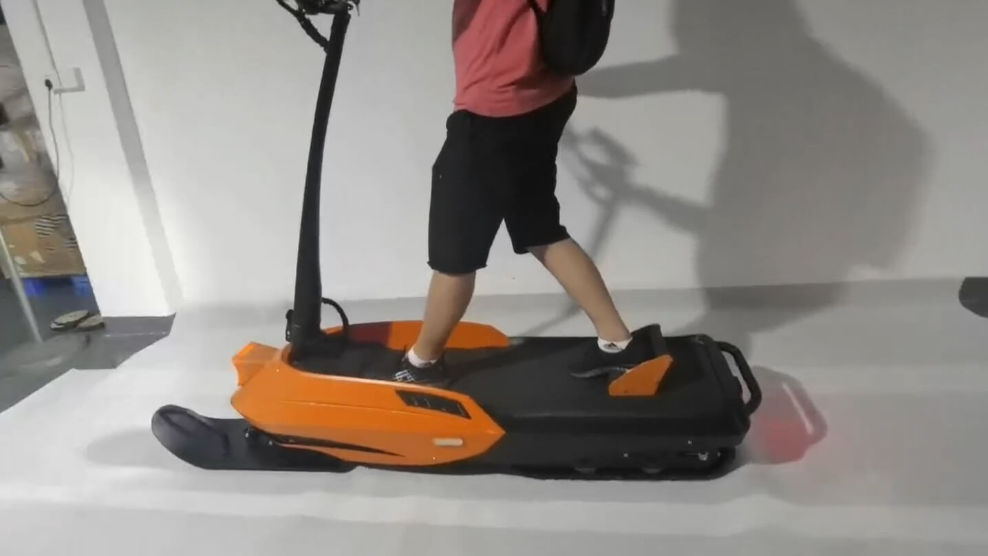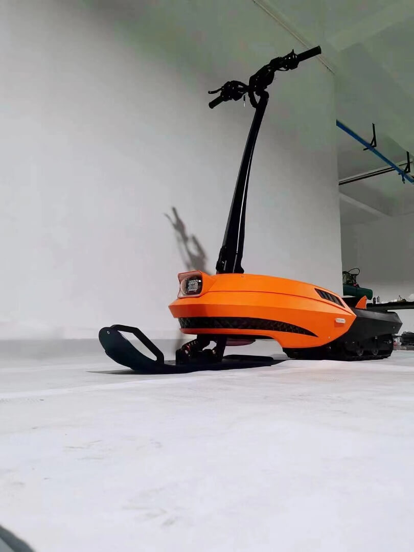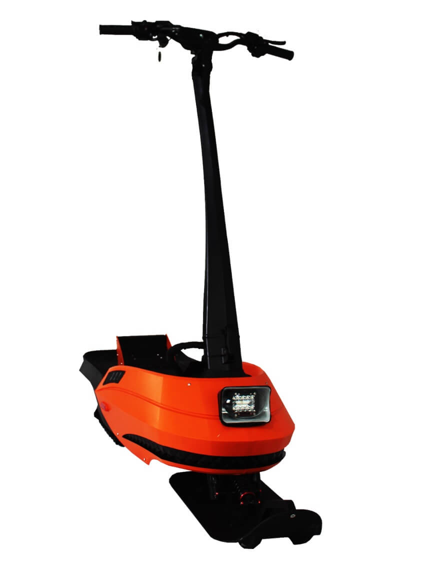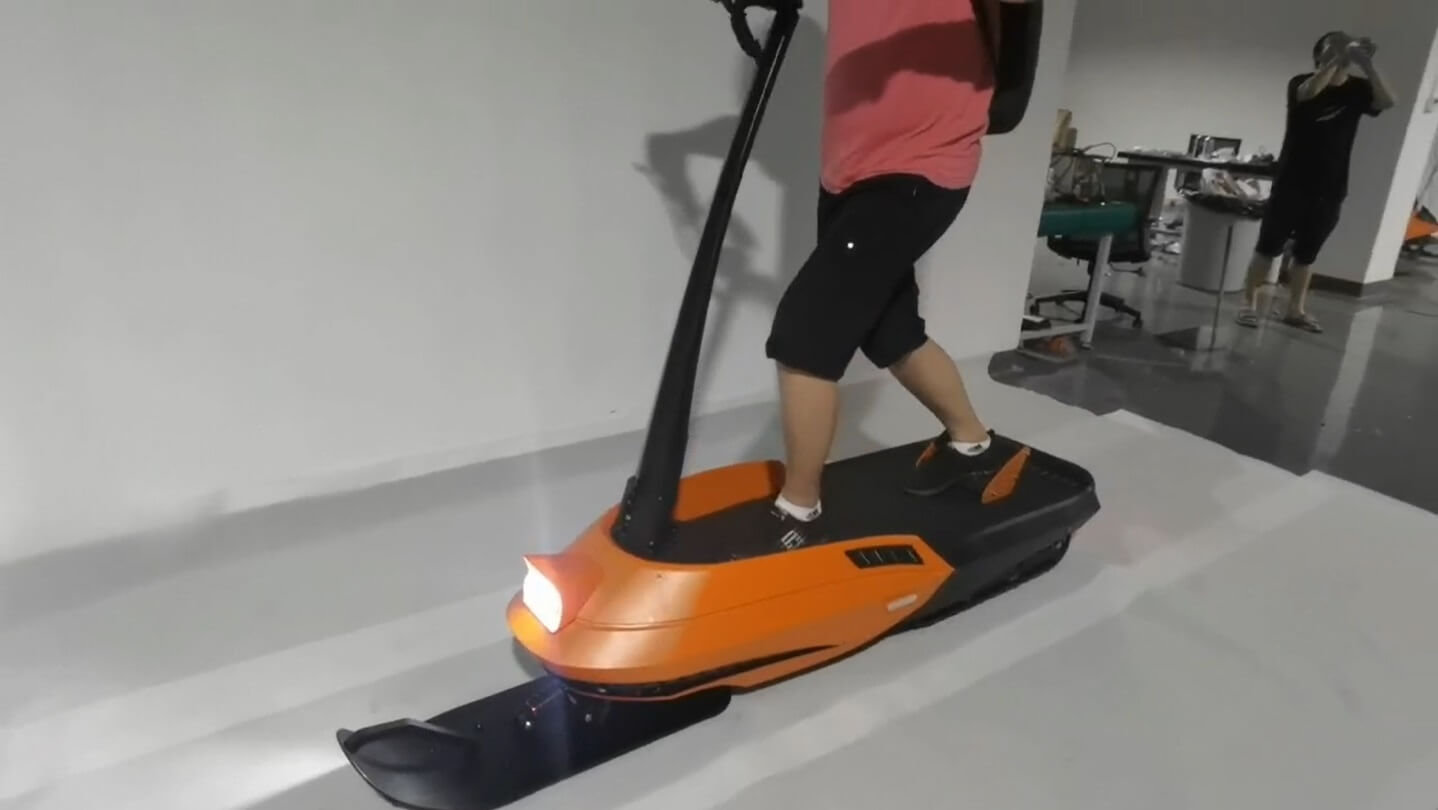 Стоячий электрический одноколейный снегоход— с одной гусеницей и одной лыжей. По сути является легким снегоходом. Вездеход отлично подходит для рыбалки и охоты. Удобно проезжать через ветки и кусты, лыжи не цепляются. По сути это аналог мотосноуборда.