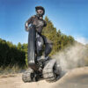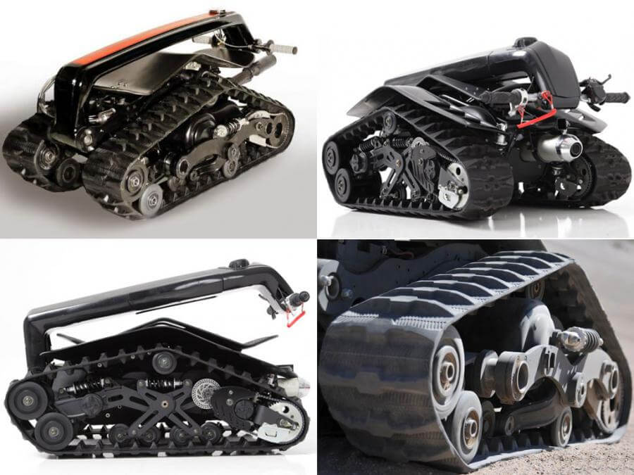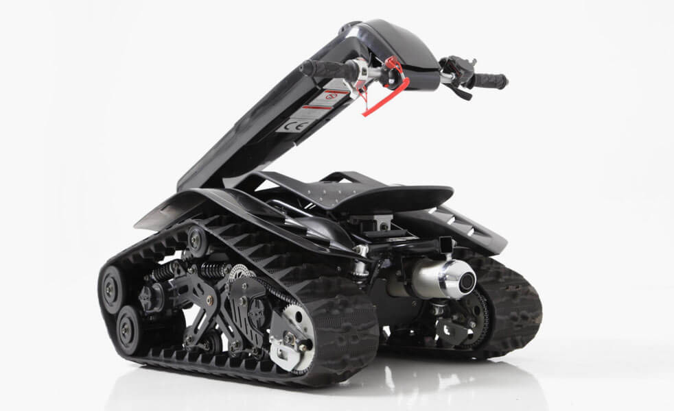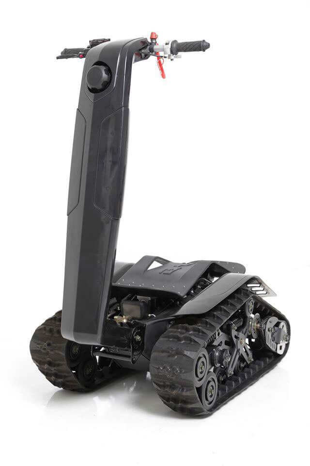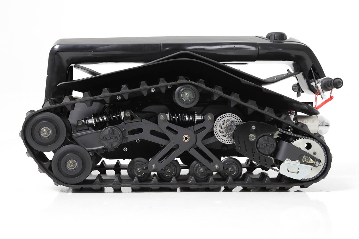 Для своих компактных размеров (длина аппарата 76 см, его ширина 56 см, а высота всего лишь 43 см) и веса в 38-57 кг этот гусеничный самокат имеет довольно мощный 200 см3 двигатель, мощностью в 14 лошадиных сил (позволяет разогнать устройство до 48 км/час), который позволяет перевозить не только человека, но еще и маленький прицеп, весом до 550 кг.