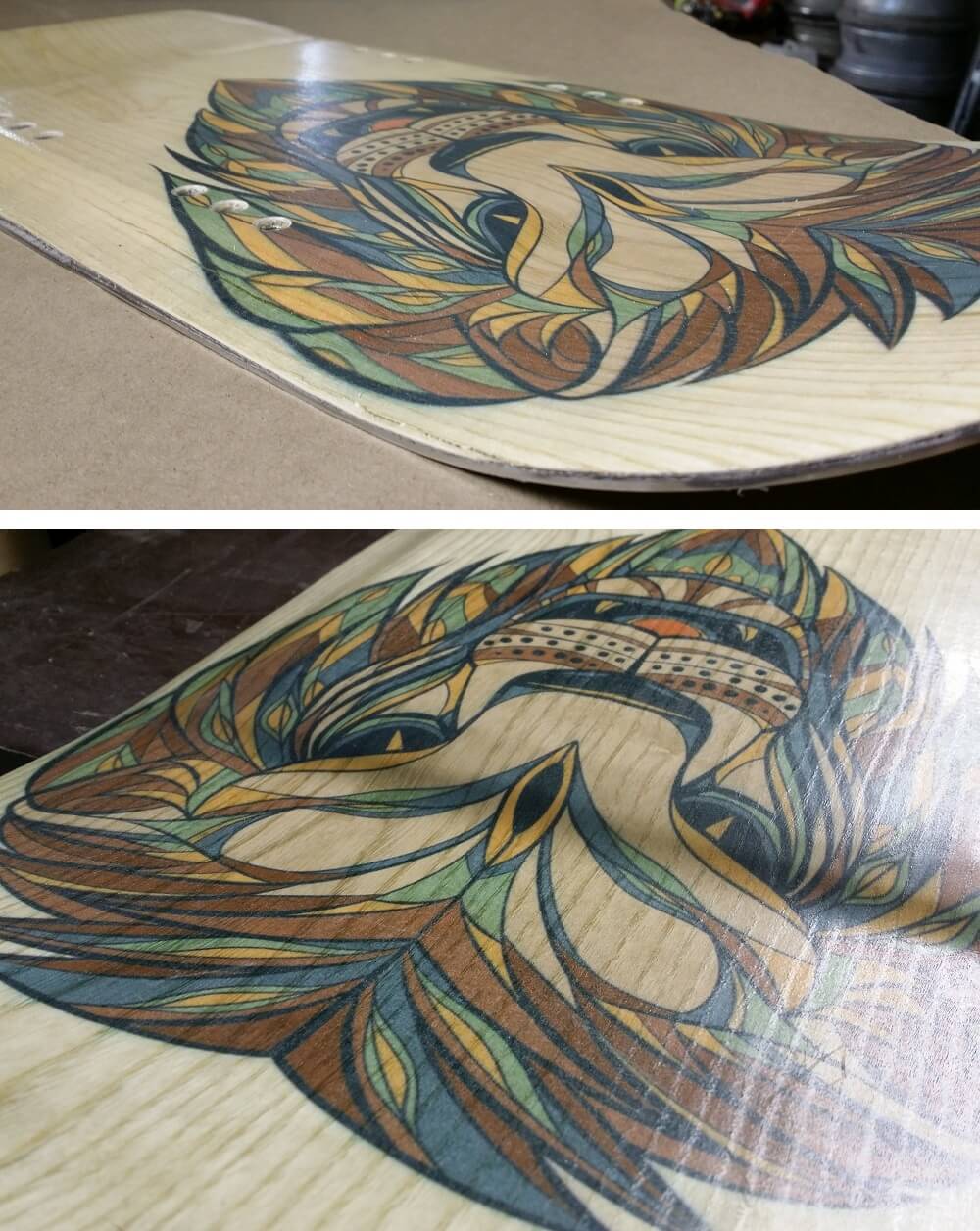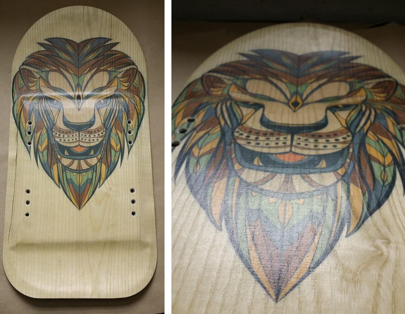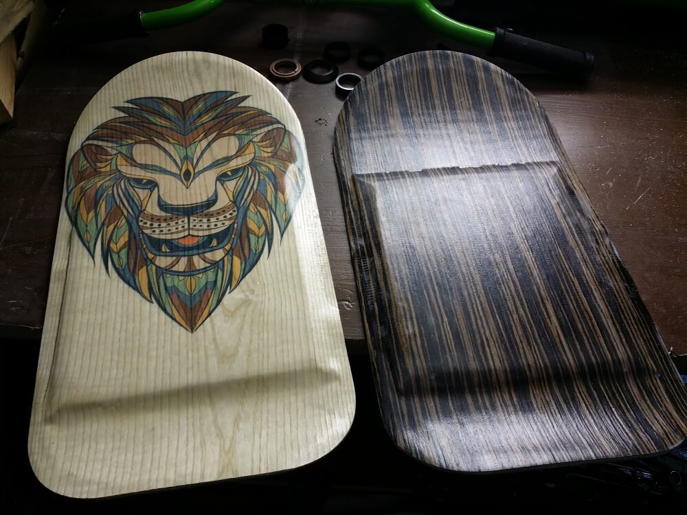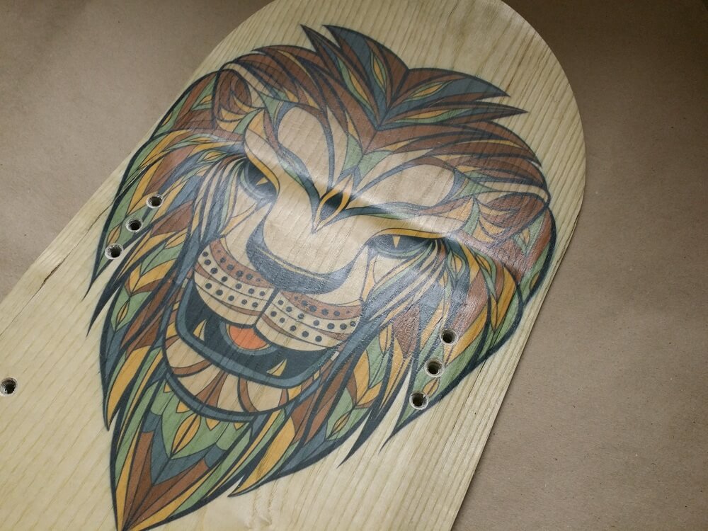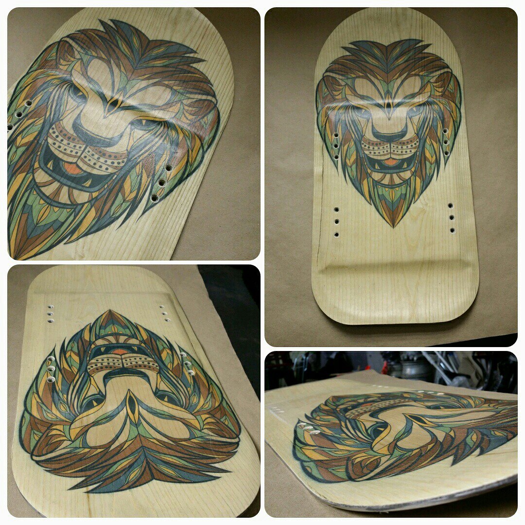 Это уже третье поколение наших досок. Теперь пробуем наносить цветную картинку на декоративном слое доски, получается очень приятно и привлекательно. Картинка «Lion». При желании можем нанести вашу картинку или логотип на декоративный слой доски. Без картинки доска будет стоить соответственно дешевле.