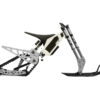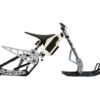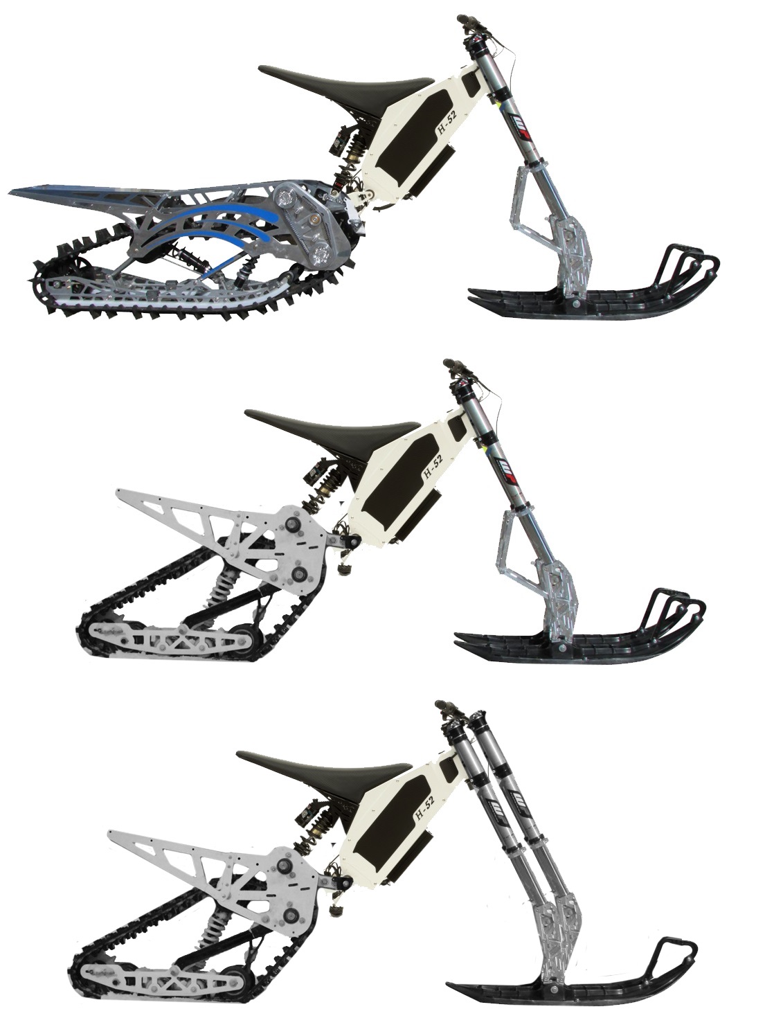На изображениях представлен концепт, который сейчас находится на стадии доработки под заказ. В этом варианте мы решили объединить велосипедную раму и съемный гусеничный комплект. Это позволит полноценно использовать седло во время езды, что повысит комфорт для пользователя. Также это дает возможность поднять двигатель (по сравнению со сноускутером), и проезжать не только по снегу но и по торосам (вода на льду).