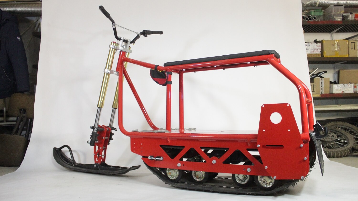 Рама для самостоятельной сборки снегохода, сноубайка или вездехода. Поставляется без мотора и системы питания. Вместо лыжного модуля может быть установлено колесо. Благодаря катковой подвеске может эксплуатироваться как зимой так и летом по грязи, песку, гравию, болоту. По сути это аналог мотосноуборда. Мотосноуборд это гусеничное шасси где водитель стоит сверху и управляет как сноубордом.