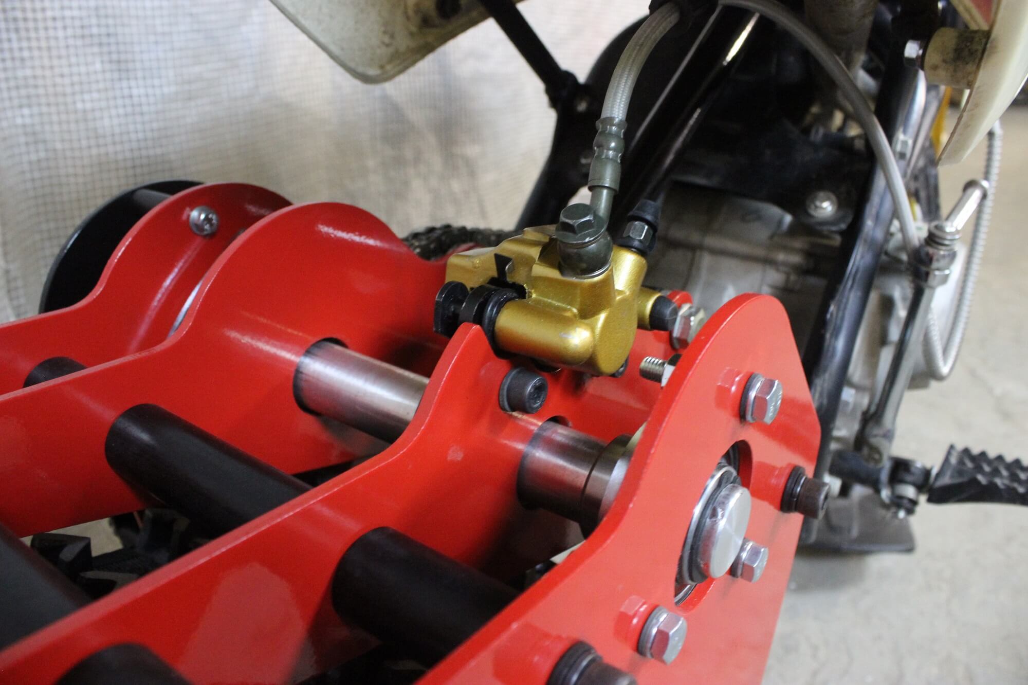 Легко устанавливается на мотоцикл, монтаж вы сможете выполнить самостоятельно. Сзади снимается маятник в сборе и заменяется на гусеничный модуль. Спереди снимается колесо и устанавливается стыковочный узел. На хвост вы можете установить сумку, канистру или оборудование, для этого имеются специальные крепления.