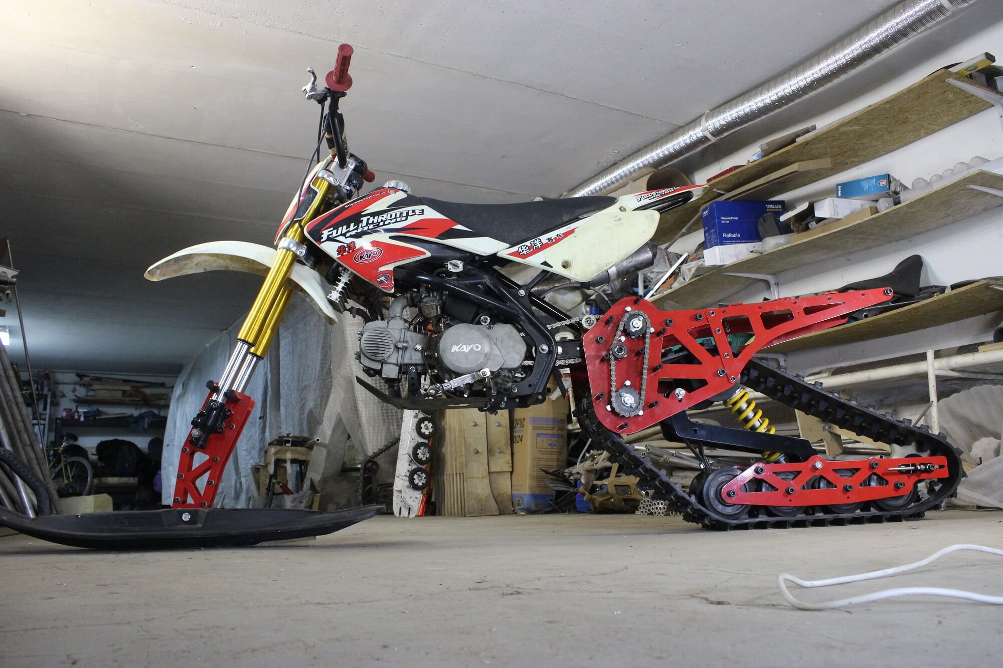 Гусеничный питбайк это, по сути, одноколейный снегоход. Вы получаете возможность продлить сезон и эксплуатировать мотоцикл не только летом но зимой.