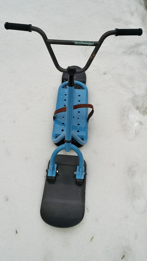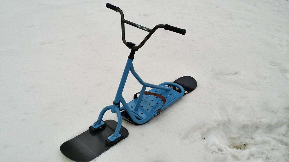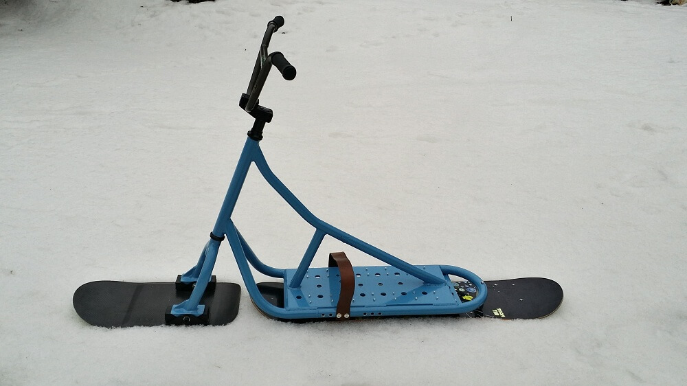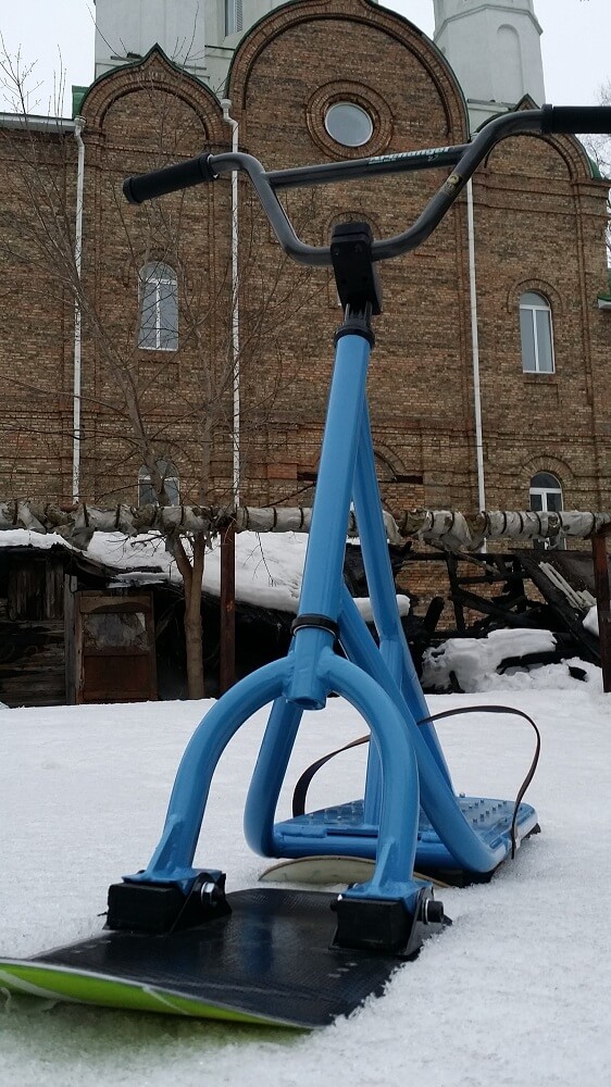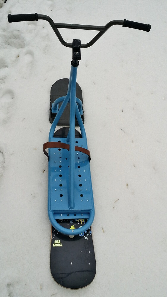 4) Задняя доска. Мы решили использовать небольшой лайфхак и установили в качестве задней доски — детский сноуборд. Это значительно дешевле чем покупать новую доску именно для сноускута. Кроме того найти детский сноуборд на авито не так сложно. Это позволило нам максимально снизить стоимость всего снаряда. Ростовка доски 110 см.