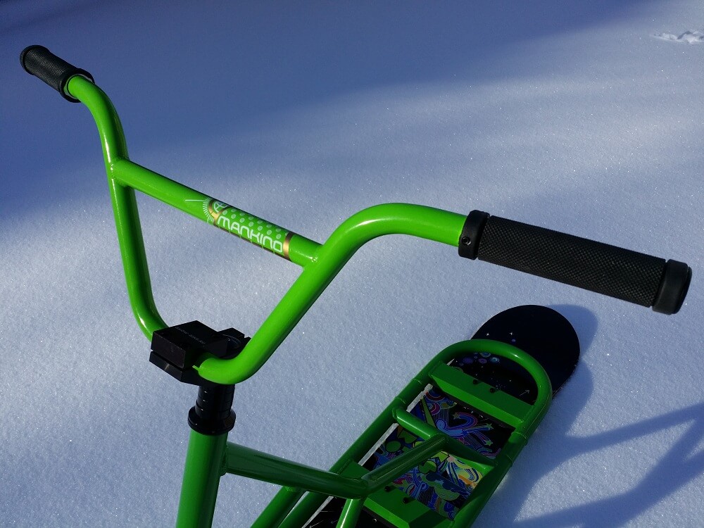 Теперь основное. Рама и вилка — алюминий (сплав АМГ6). Вес рамы 2887 грамм. Грипсы со стопором (не прокрутятся при попадании снега). Передняя доска нашего производства. Винты под шестигранник №6. Рулевая — неинтегрированная на промышленных подшипниках. Руль алюминий «mankind» (диаметр 22.2). Вынос — фрезерованный алюминий собственного производства под шток 28 мм (не стандарт).
