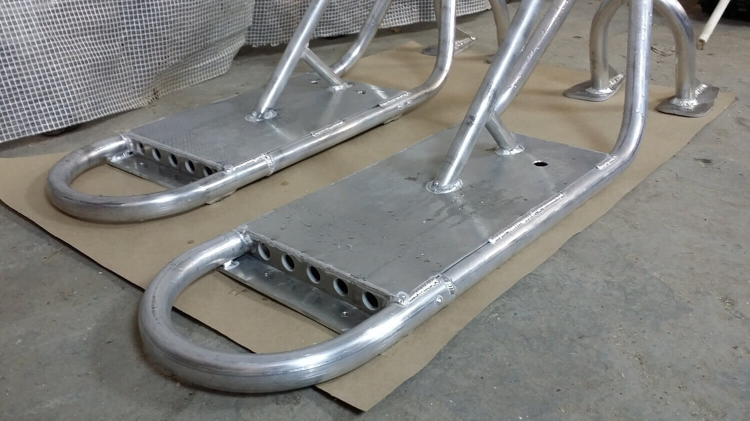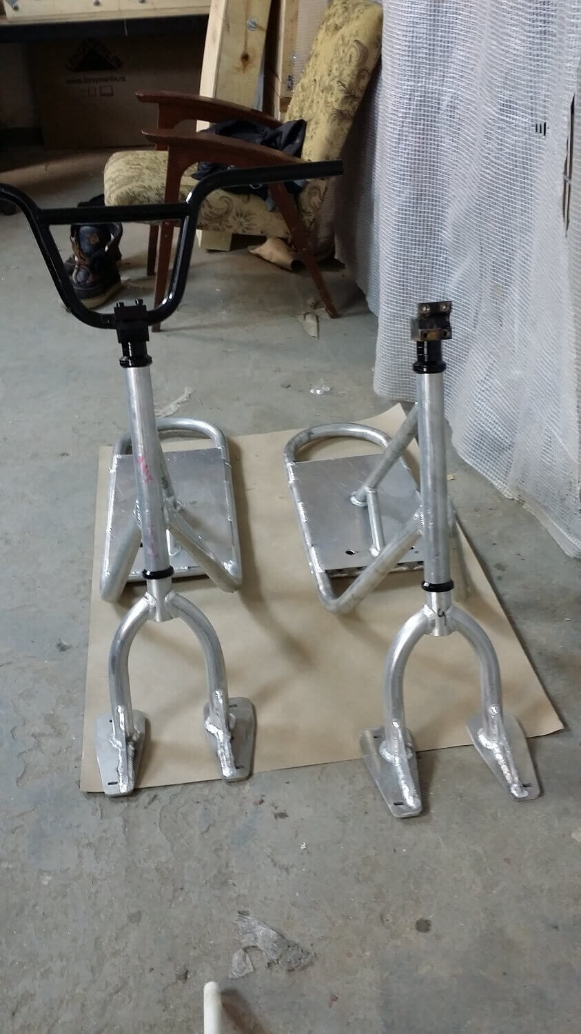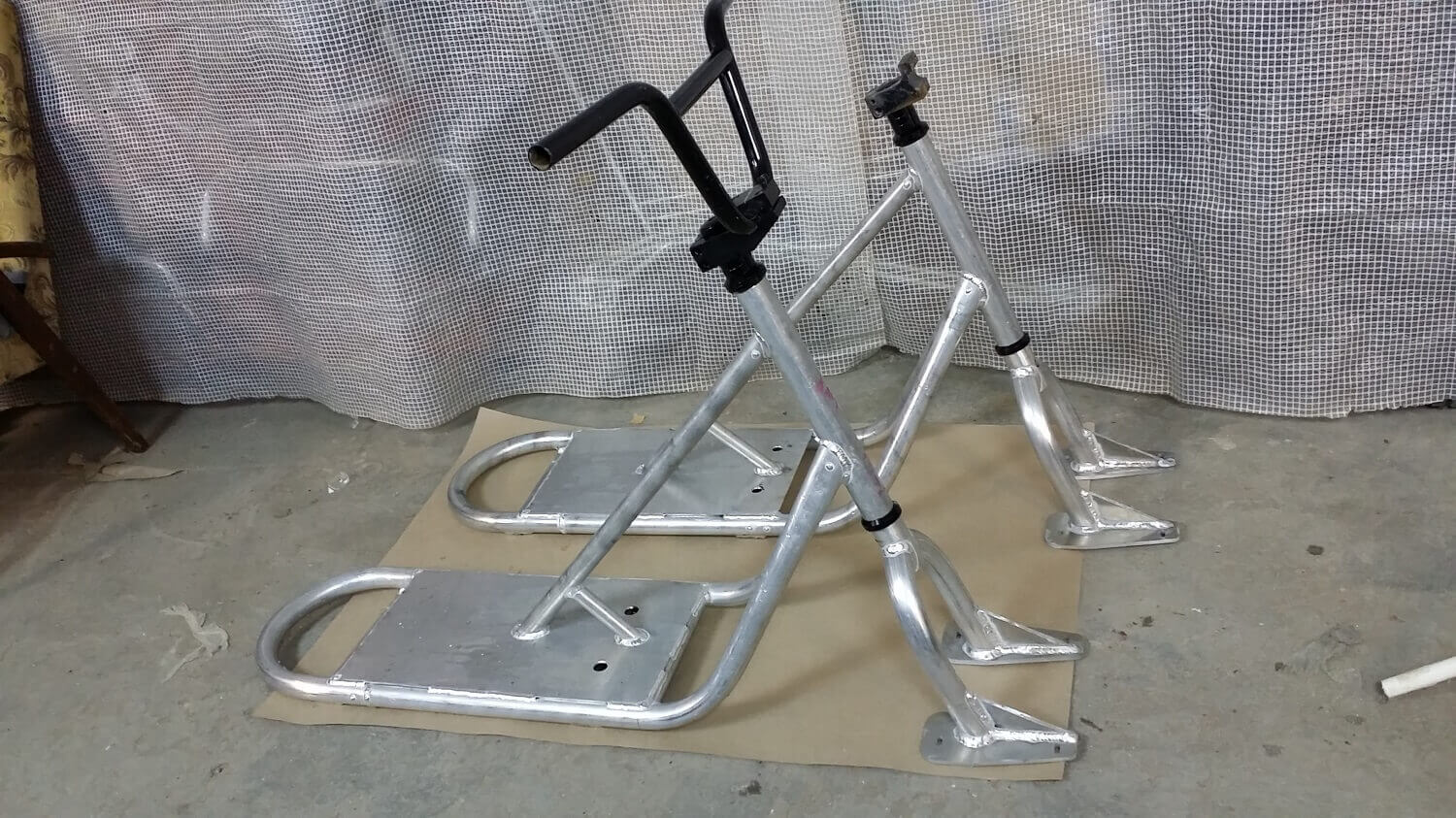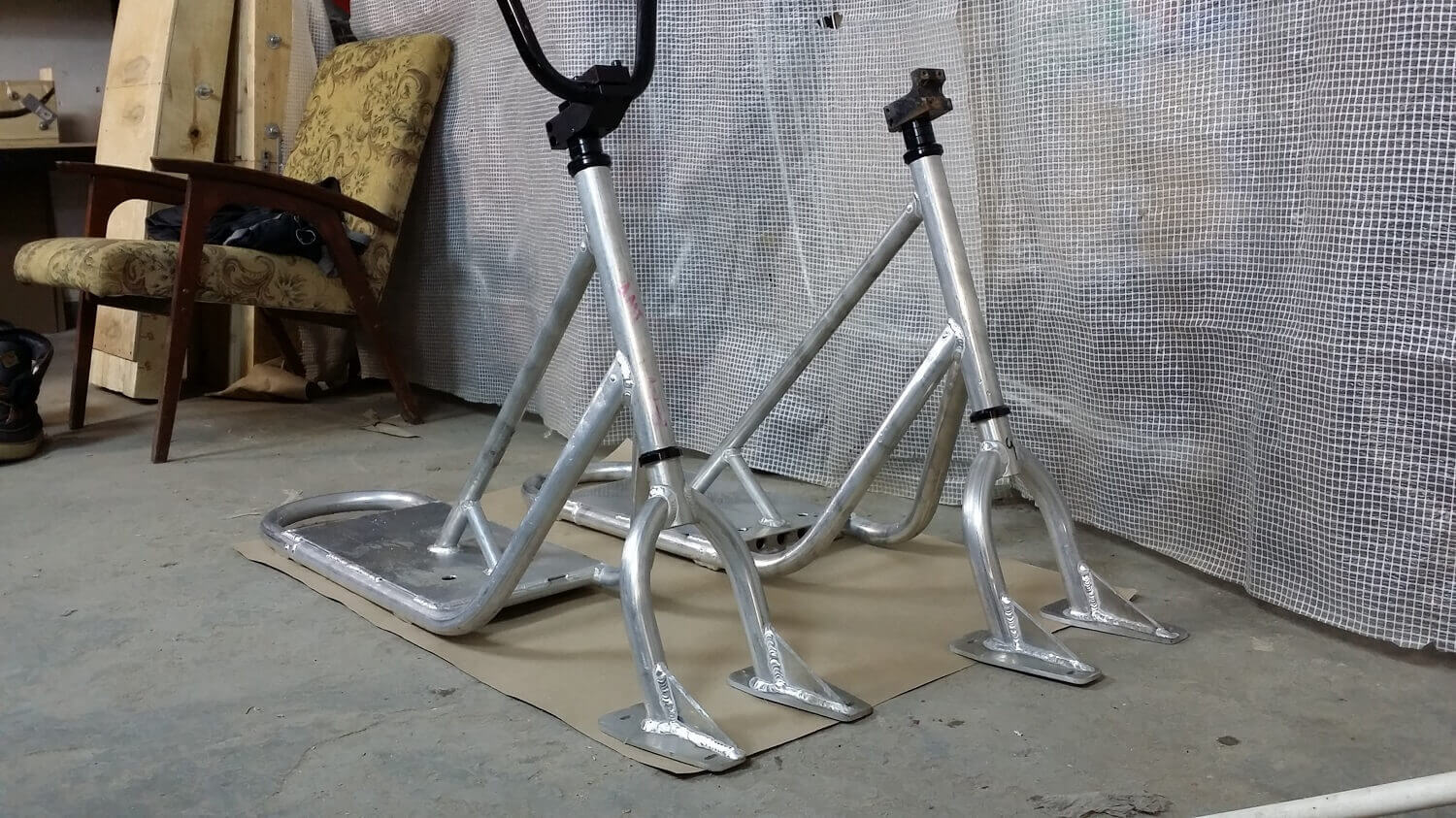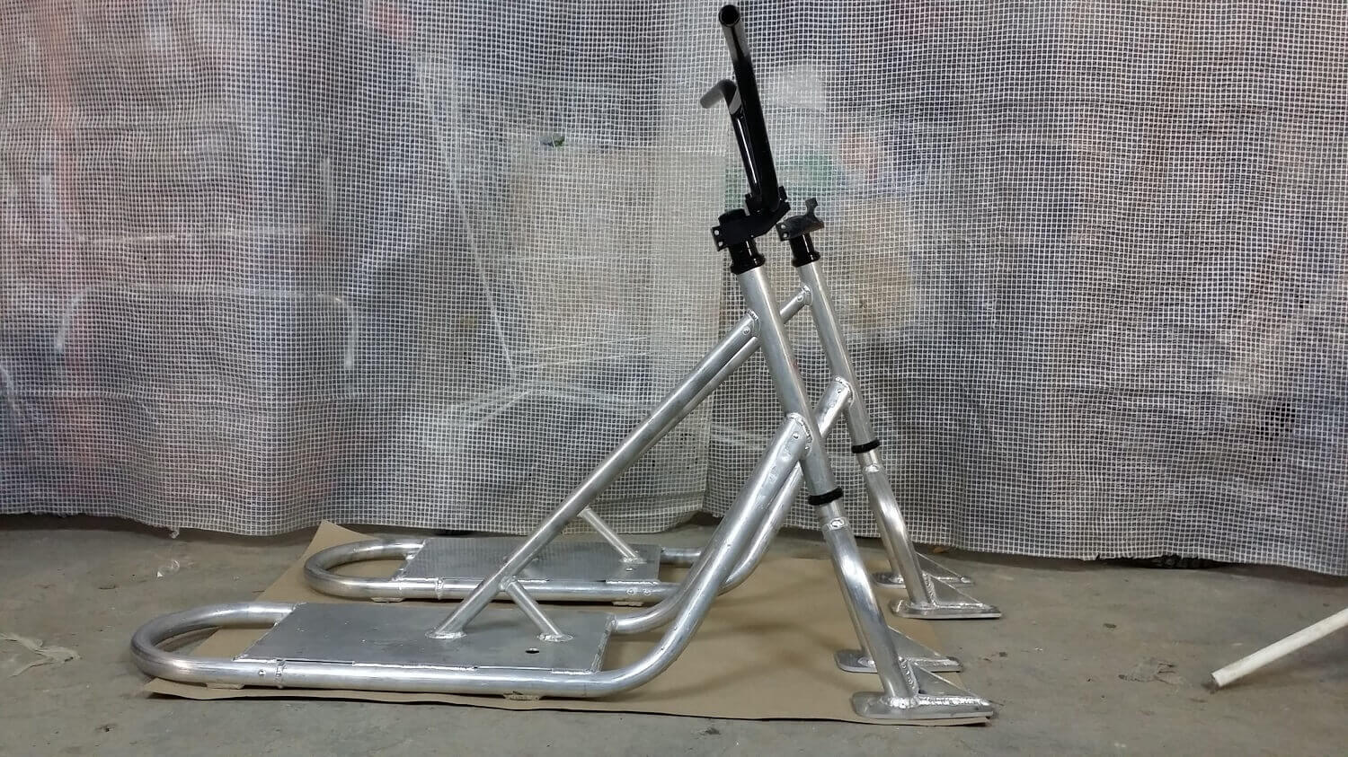 Материал рамы — алюминий АМГ5. Рулевой стакан под неинтегрированную рулевую колонку. Можно использовать рулевую на шарах или на пром подшипниках. Вилки от других фирм сноускутов могут не подойти, мы сами не тестировали.