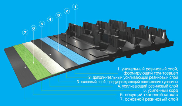 Гусеница имеет грунтозацеп и производятся по уникальной технологии с использованием усиленного корда с 3-х кратным запасом прочности, выдерживающего любые экстремальные нагрузки, и нескольких специальных видов резиновой смеси с добавлением силикона. Помимо этого, в гусеницах, изготовленных для импортных снегоходов, в состав резины, используемой для формирования грунтозацепа внесен специальный порошкообразный компонент, придающий гусенице уникальные свойства.