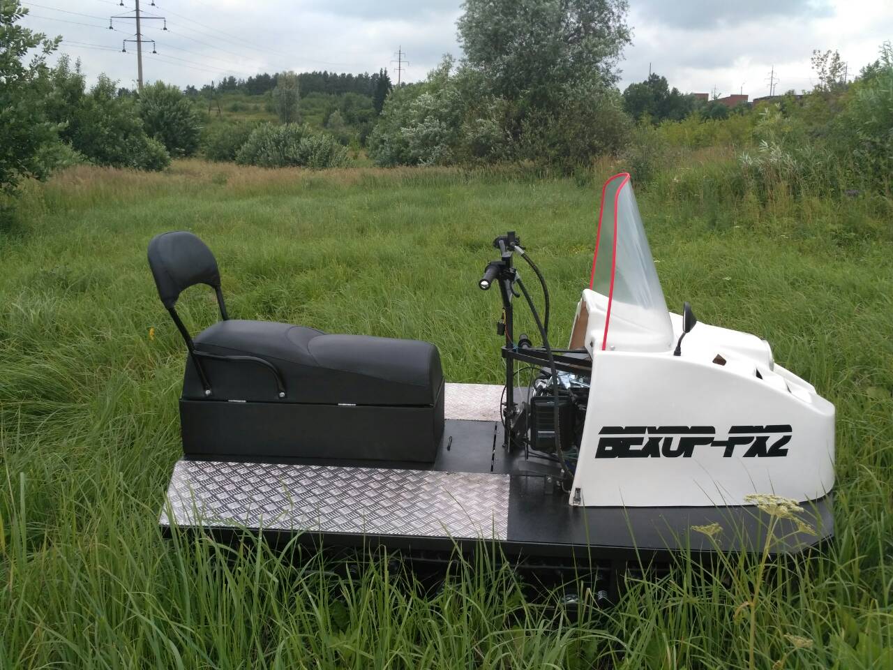 На недорогой миниболотоход установлено удобное, широкое сидение со спинкой, под которым есть пространство для перевозки снастей и экипировки. Лёгкий, компактный вездеход и снегоход Вехор-RX2 – отличное мобильное средство для передвижения по бездорожью, а значит он идеально подходит для охоты и рыбалки. До места эксплуатации транспортировать его можно в автомобильном прицепе или в кузове небольшого фургона.